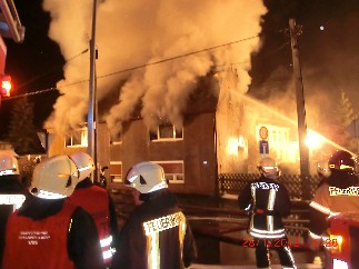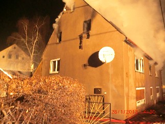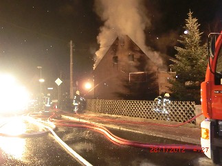 Beim Eintreffen der Wehren standen bereits Teile des Hauses und des Dachstuhls im Vollbrand. Wir unterstützten die Kameraden bei der Wasserversorgung und mit Atemschutzgeräteträgern für den Innenangriff sowie weiteren Kameraden für den Außenangriff. Durch die starke Rauchentwicklung im Haus und den Vollbrand des Dachstuhls, gestaltete sich der Innenangriff sehr schwierig. Erst durch das Belüften des Wohnhauses konnten Atemschutzgeräteträger effektiv in den oberen Stockwerken löschen. Von Außen wurde auf mehreren Gebäudeseiten gelöscht und durch die Drehleiter von Stollberg wurde das Dach teilweise geöffnet um besser an den Brandherd zu kommen.
